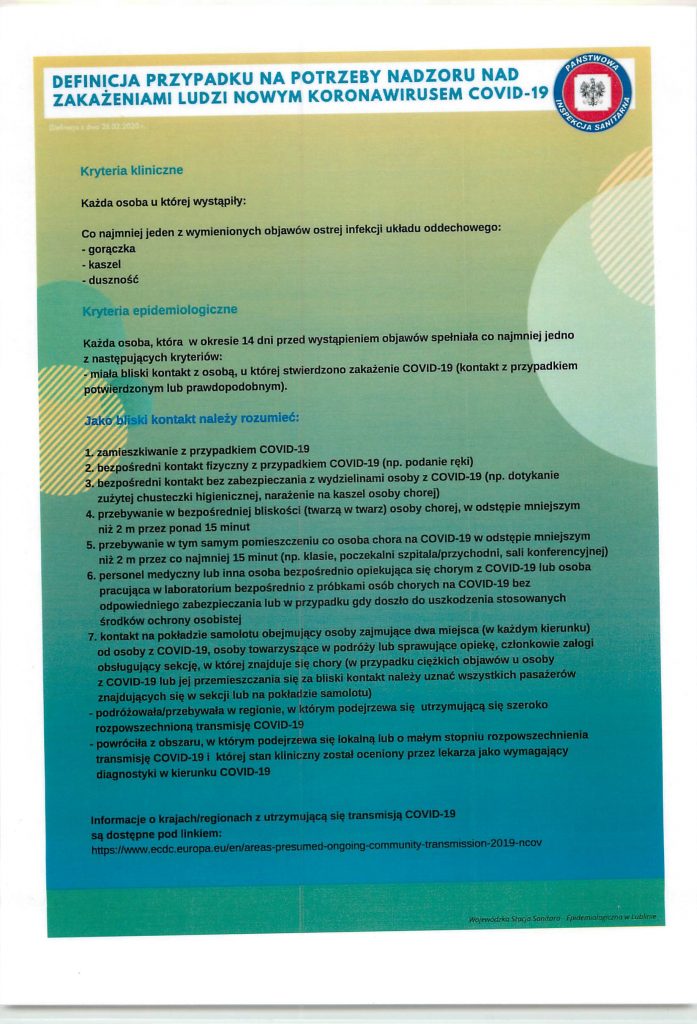 Koronawirus – informacje Powiększ obraz Definicja przypadku na potrzeby nadzoru nad zakażeniami ludzi nowym koronawirusem COVID-19. Opublikowano w dniu 12 mar 2020 Autor: Marcin Wilkos