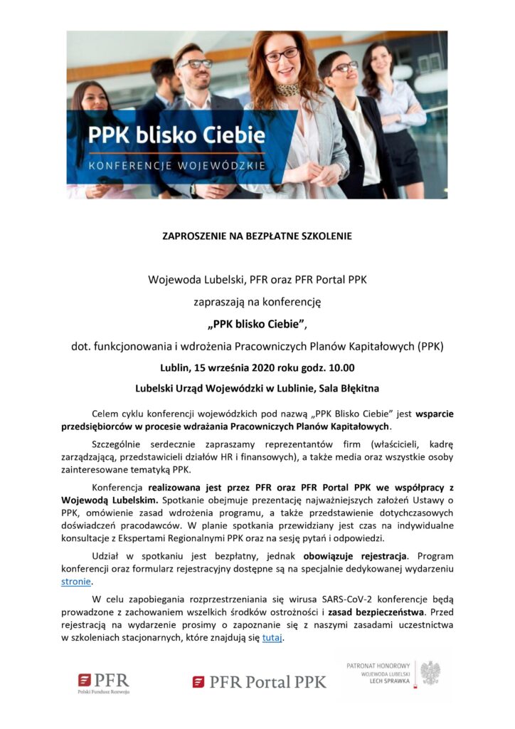 Bezpłatne szkolenie z PPK Powiększ obraz Zaproszenie Wojewody Lubelskiego na konferencję „PPK blisko Ciebie” Opublikowano w dniu 07 wrz 2020 Autor: Szymon Patkowski
